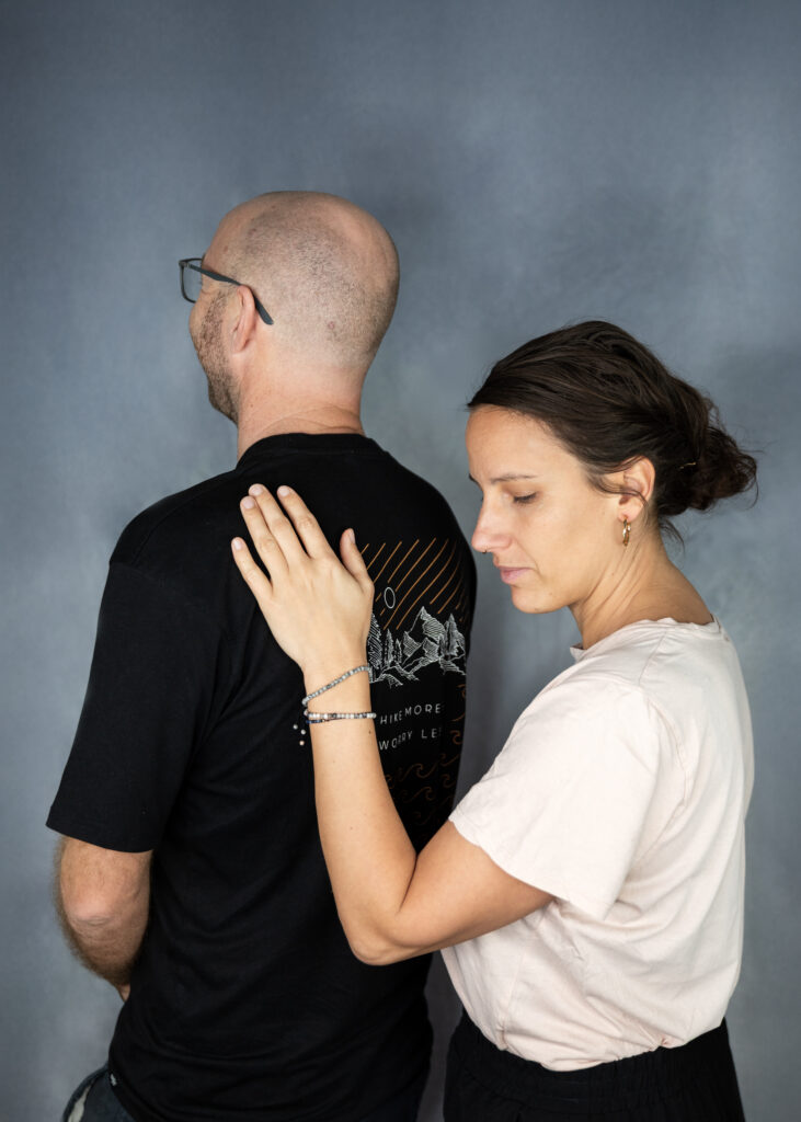 Die Berührung selbst ist ruhig, langsam und nicht stimulierend. Sie besteht aus haltender oder aufliegender Berührung, zum Beispiel einer ruhigen Hand auf dem Rücken, auf der Schulter oder an den Oberarmen oder auch eine sanfte oder feste Umarmung. Es gibt keine erotischen oder zielgerichteten Techniken. Die Kleidung bleibt an, die Berührung bleibt klar, präsent und respektvoll.